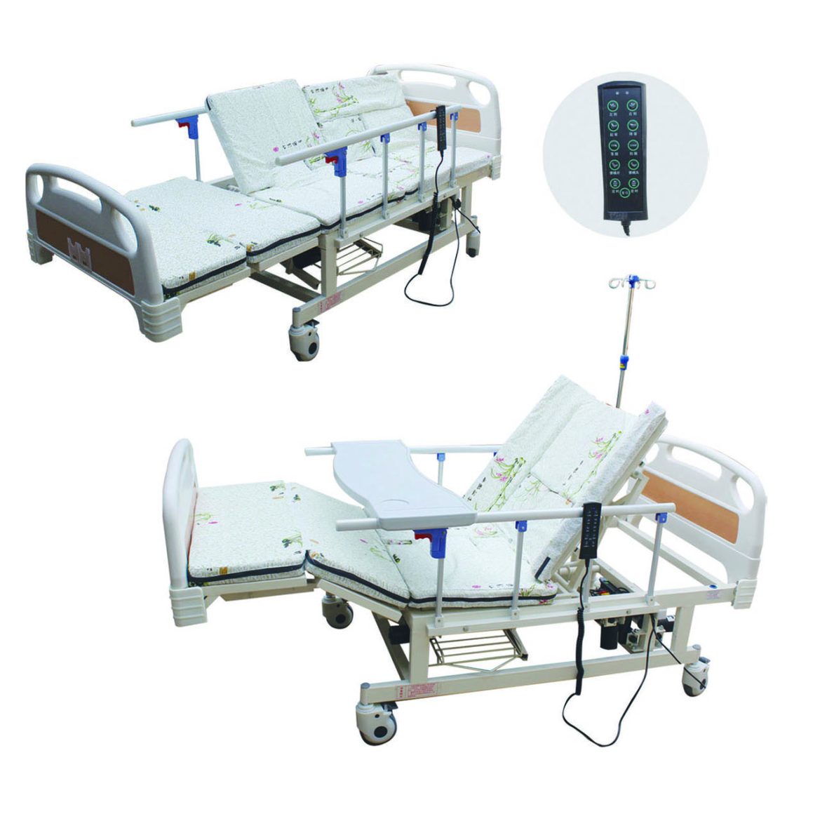 配置參數(shù): ABS床頭+4柱半護(hù)欄+ABS餐桌+靜音腳輪+輸 液架+6cm床墊+便盆+洗頭盆+便口
